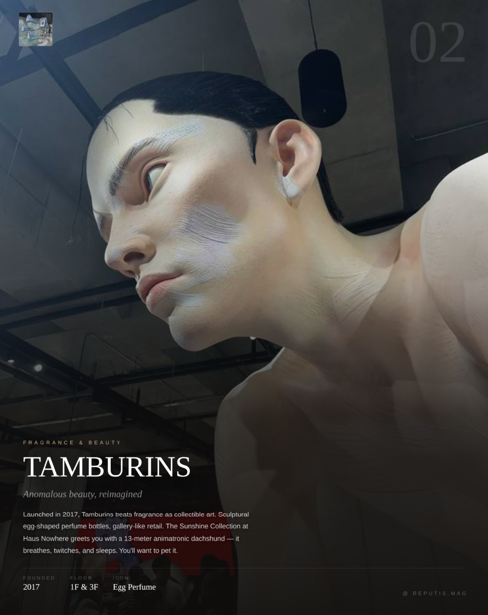 Tamburins launched in 2017 as IICOMBINED’s entry into fragrance and beauty, and it has quickly earned a cult following for its sculptural packaging and gallery-like retail environments. The brand’s egg-shaped perfume bottles and chain-detailed hand creams have become icons of Korean beauty culture.